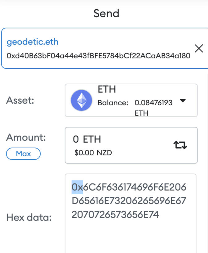🤑 Send 0 eth to geodetic.eth and paste Hex data into Metamask field.